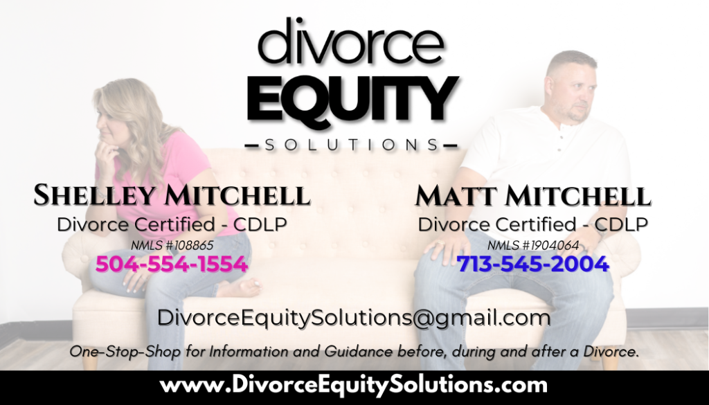 At Divorce Equity Solutions, we specialize in helping clients navigate the financial complexities of divorce with confidence and clarity. As Certified Divorce Lending Professionals (CDLP®), our team bridges the gap between divorce, real estate, and mortgage lending to create strategies that protect your financial future. We work closely with home-owners, realtors, attorneys, mediators, and financial planners to ensure the right approach for dividing property, qualifying for mortgages, and securing long-term stability. Whether you’re looking to keep your home, sell your property, or plan your next move, Divorce Equity Solutions provides expert guidance and customized solutions to help you make informed decisions during one of life’s most challenging transitions.