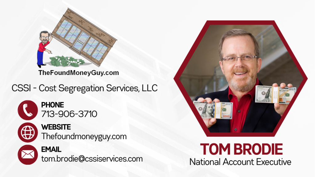 Tom Brodie is a trusted resource for property owners, investors, and financial professionals seeking to maximize their tax savings through Cost Segregation Services. With extensive experience in the field, Tom specializes in helping clients identify opportunities to accelerate depreciation, improve cash flow, and unlock significant tax benefits on commercial and residential investment properties.